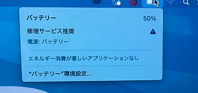 デスクトップの右上にバッテリーのアイコンがありますが、クリックすると修理サービス推奨と表示されているのが確認できます。