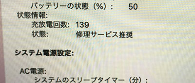 こちらの画像は「このMacについて」からバッテリーの状態を確認しているところですが、充放電回数139回、修理サービス推奨とこちらでも表示されておりますね。