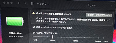 Mac OS、機種によっては「バッテリー要交換」「バッテリー交換修理」などと表示されますが、内容は同じです。