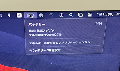 電源コンセントを接続すると問題なく使えるのですが、バッテリーアイコンのところにカーソルを当てるとエラー表示らしき物が確認できます。